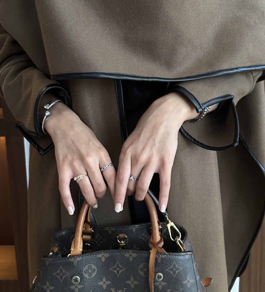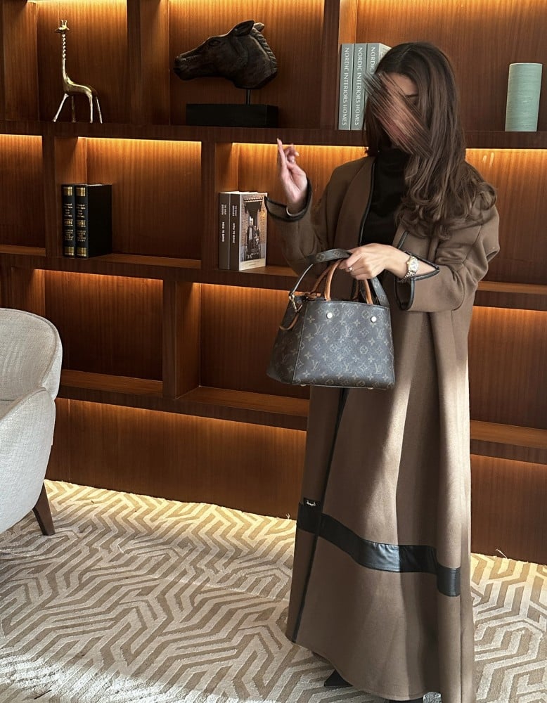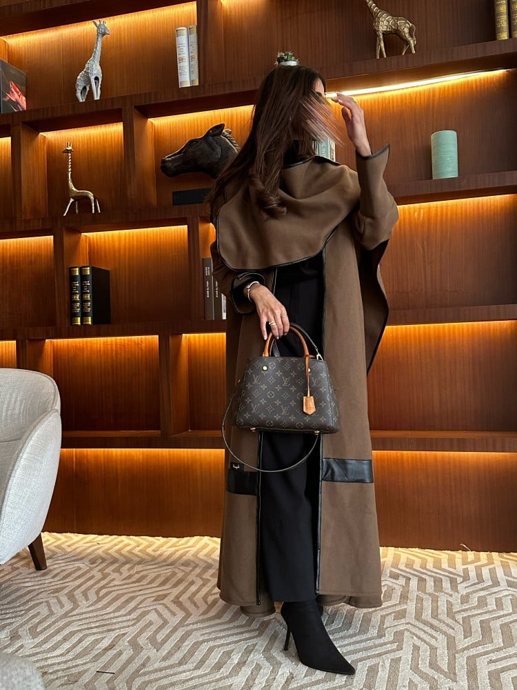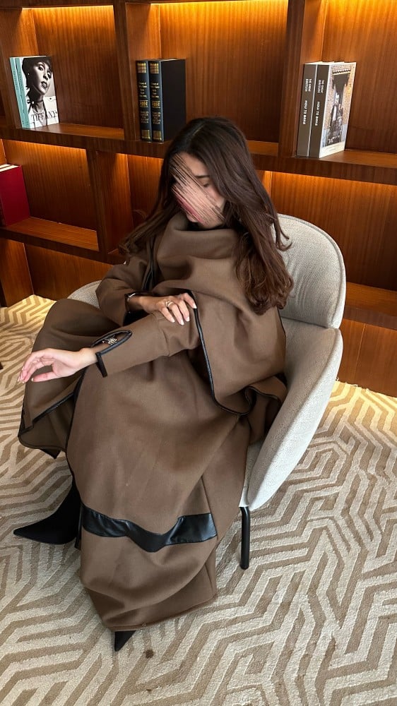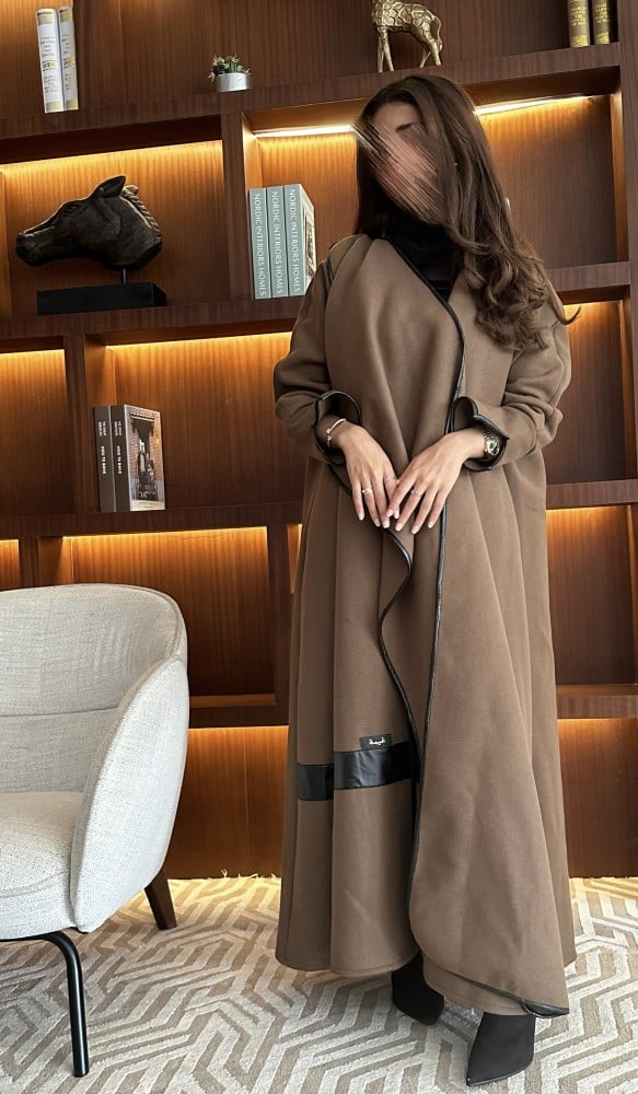 •جوخ بني على زيتي+ جلد بقصة كلوش مع وشاح متصل بطقطق من الجهتين